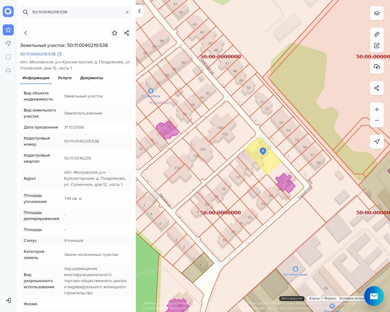 Земельный участок, площадь – 748 кв.м, кадастровый номер: 50:11:0040219:538 Адрес: Московская обл., р-н Красногорский, д. Поздняково, ул. Солнечная, дом 12, часть 1.