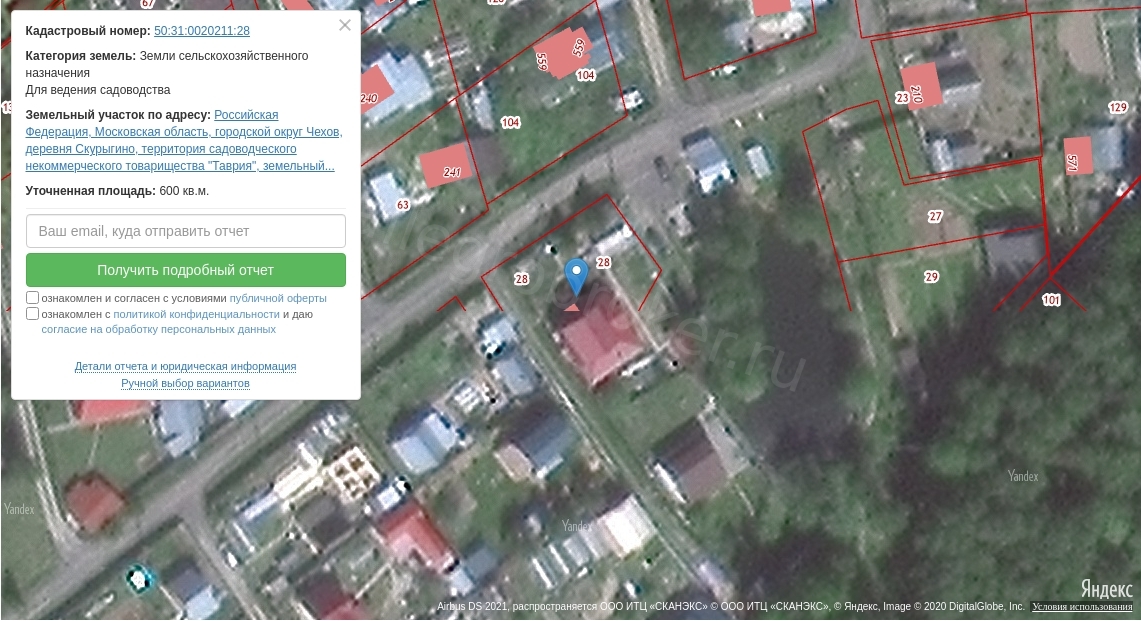 Земельный участок, категория земель: Земли сельскохозяйственного назначения, разрешенное использование: для ведения садоводства, общая площадь: 600 кв. м., кадастровый номер: 50:31:0020211:28. Право собственности. Адрес: Московская область, городской округ Чехов, деревня Скурыгино, территория садоводческого некоммерческого товарищества Таврия, дом 28.