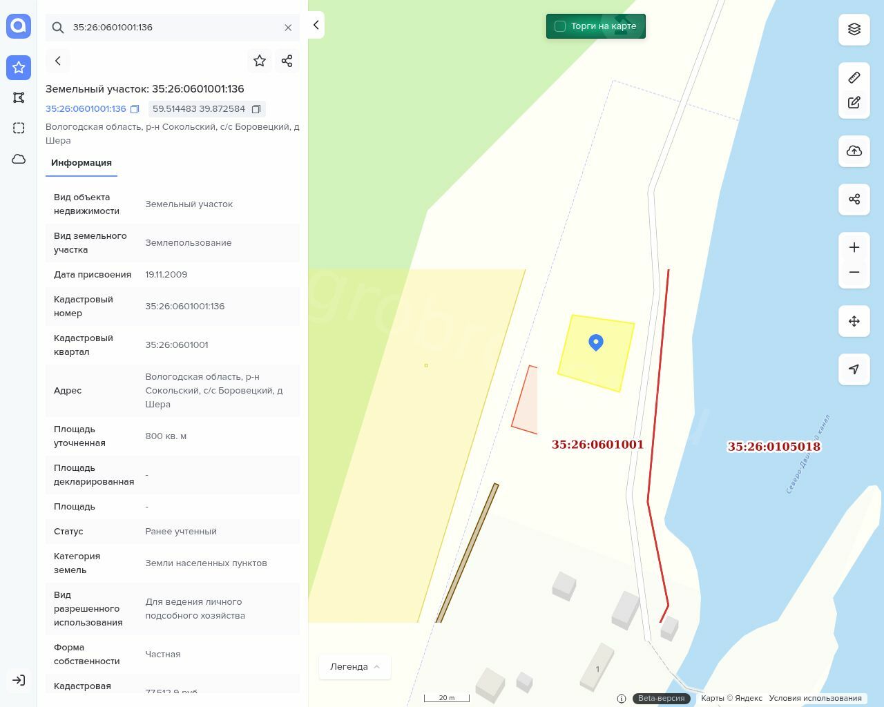 1/2 доли земельного участка, площадь 800 +/- 10 кв.м., назначение: Земли населенных пунктов, кадастровый (условный) номер: 35:26:0601001:136